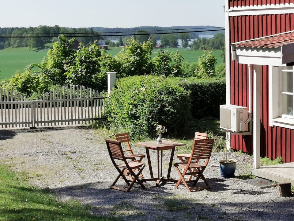 Lägenhet i villa med lantlig känsla i Vårdinge mellan Mölnbo och Gnesta, med underbar utsikt över fält och sjön Sillen. Lägenheten har ett sovrum, kök med matplats, toalett, dusch och tvättmaskin, samt egen uteplats, förråd och parkering. Huset ligger ca 3,5 km från Gnesta centrum med mataffär, caféer och tågstation med regelbunden trafik till Stockholm. Bussar in till Gnesta går endast ett fåtal gånger per dag, så bil eller cykel är nödvändigt för pendlare. På några minuters promenadavstånd finns en mysig badplats i sjön Sillen.